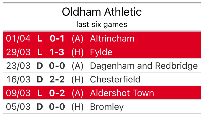 Oldham’s last match was on Monday, a 1-0 loss against Altrincham.