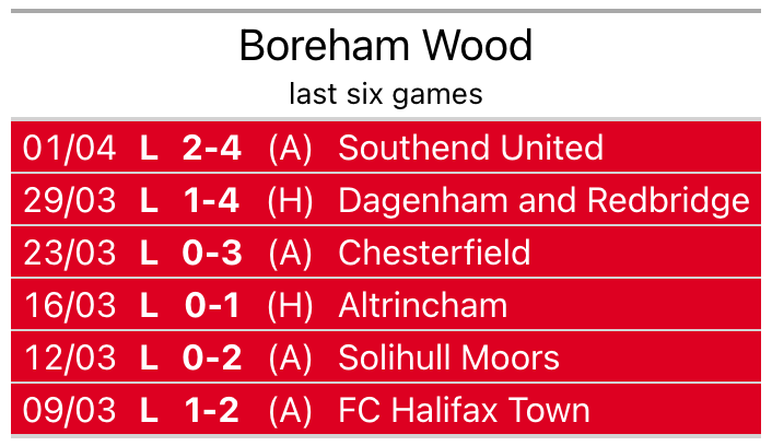 Boreham Wood’s struggles have left them with no points from their last six National League matches, while their opponents have earned four from a possible 18.