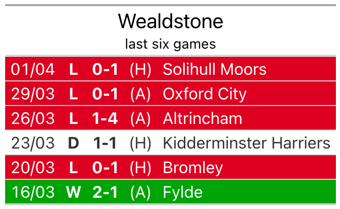 Wealdstone lost 1-0 against Solihull Moors last time out, also on Monday.