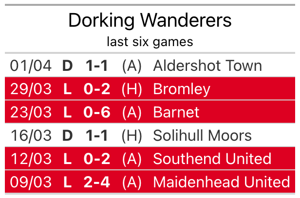 Dorking’s last match was on Monday, a 1-1 draw against Aldershot Town, with Alfie Rutherford getting the goal for Wanderers.