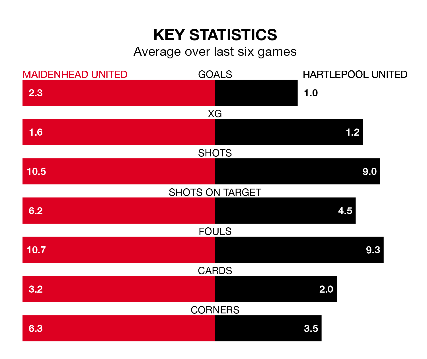 With two wins and three draws over that period, Pools’ form is slightly worse – they have taken nine points from 18, compared to Maidenhead’s 10.