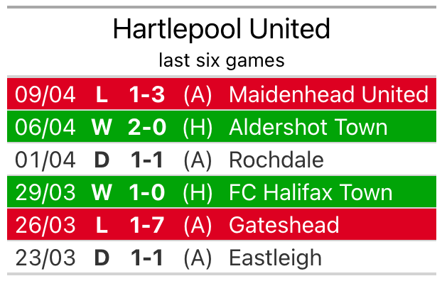 In their last league match, on Tuesday, Hartlepool lost to Maidenhead United 3-1 away, with their goal scored by Callum Cooke.