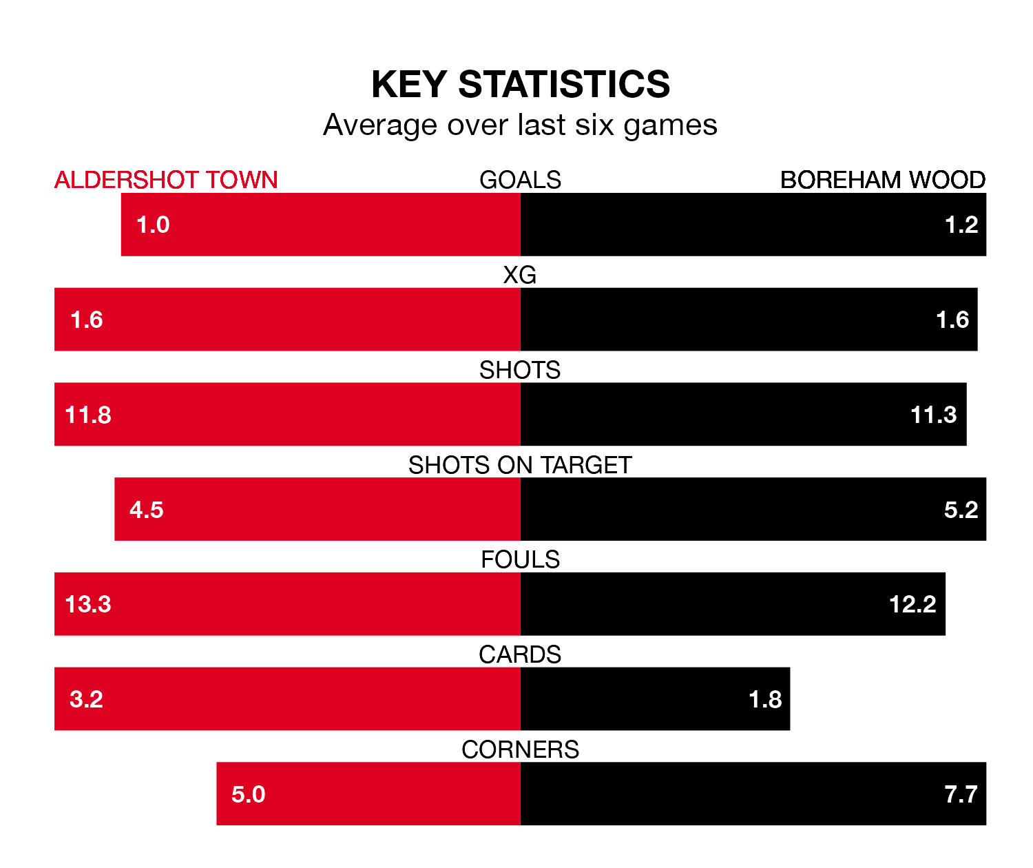 Aldershot, meanwhile, are above average scorers, with 1.6 goals per game, compared to a league average of 1.5. They have conceded 1.8 goals per game.