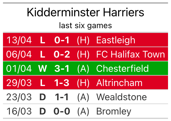 Kidderminster Harriers lost 1-0 against Eastleigh last time out, also on Saturday.