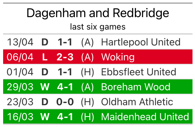 Dagenham & Redbridge are seven places behind the away side in 15th, with 14 wins and 13 draws putting them on 55 points.