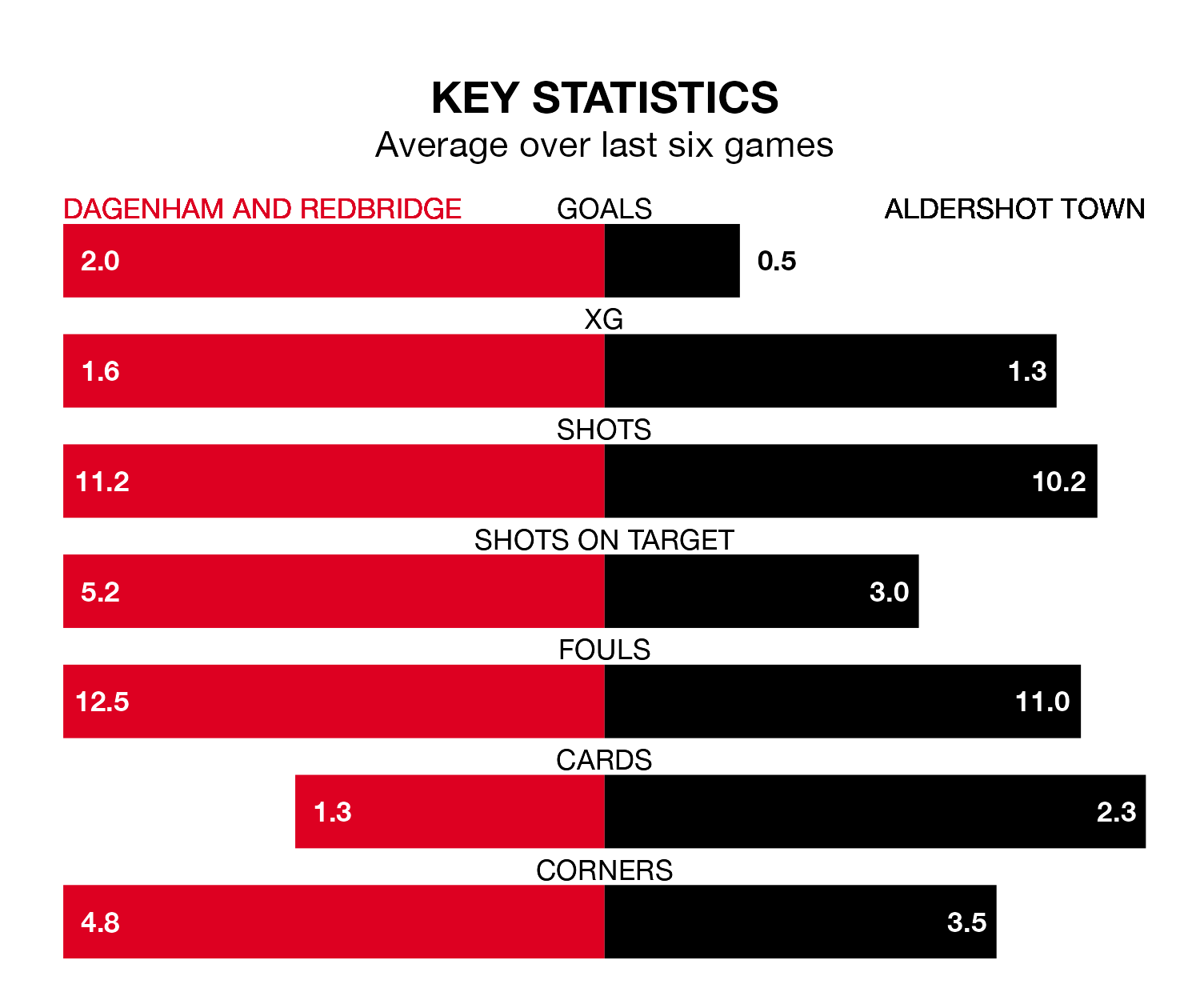Dagenham & Redbridge, meanwhile, are average scorers, with 1.5 goals per game. They have conceded 1.3 goals per game.