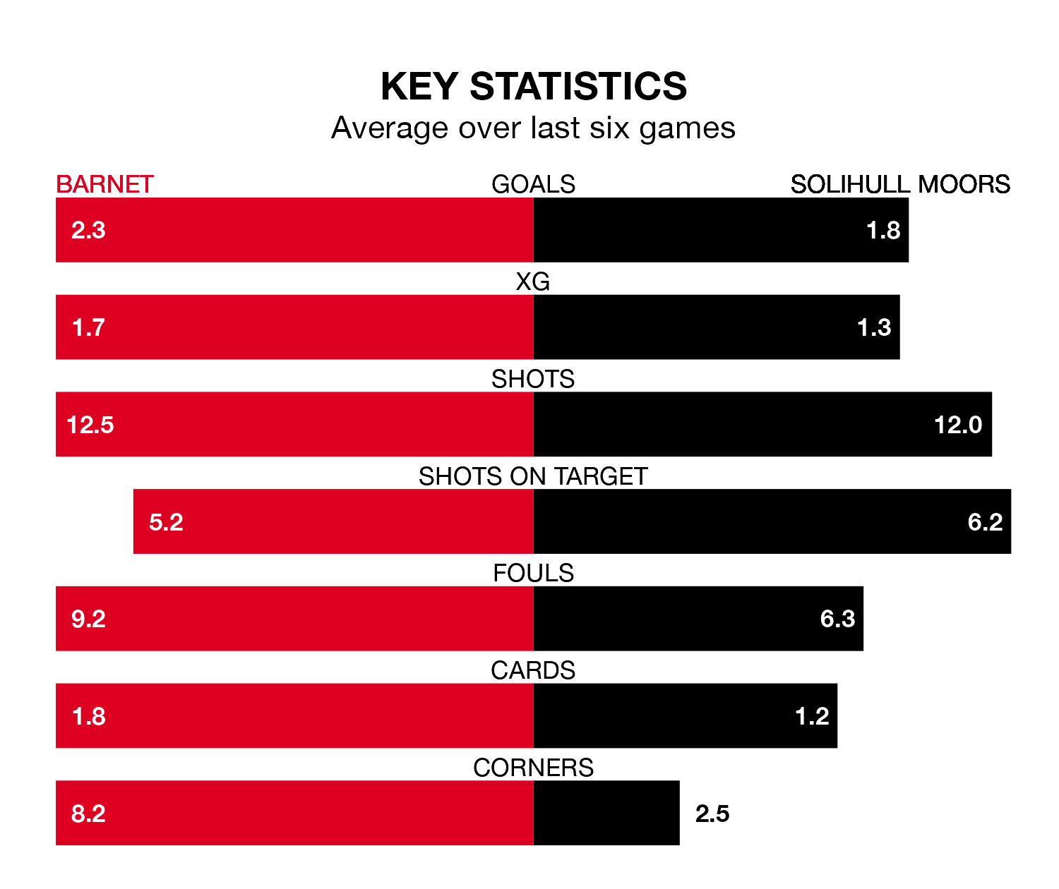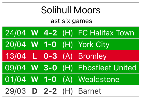 Solihull Moors are also above average scorers, with 1.6 goals per game, compared to a league average of 1.5. They have conceded 1.4 goals per game.