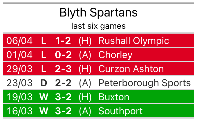 Blyth Spartans lost 2-1 against Rushall Olympic last time out, also on April 6.