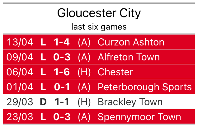 Gloucester’s last match was on April 13, a 4-1 loss against Curzon Ashton.