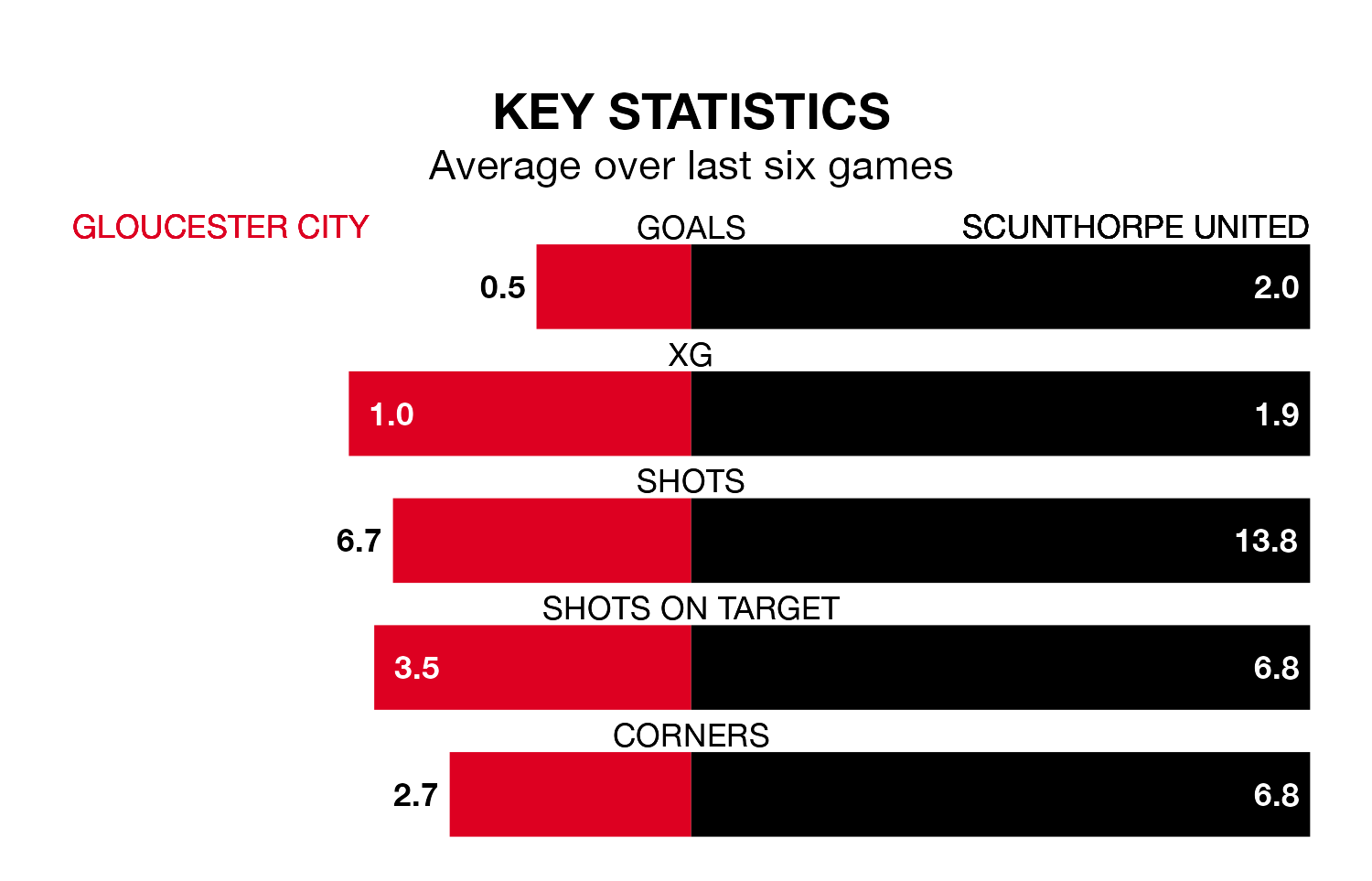 Gloucester, meanwhile, are below average scorers, with 1.1 goals per game, compared to a league average of 1.3. They have conceded 1.9 goals per game.