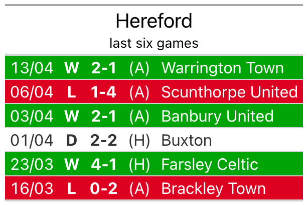 In their last league match, on April 13, Hereford beat Warrington Town 2-1 away.