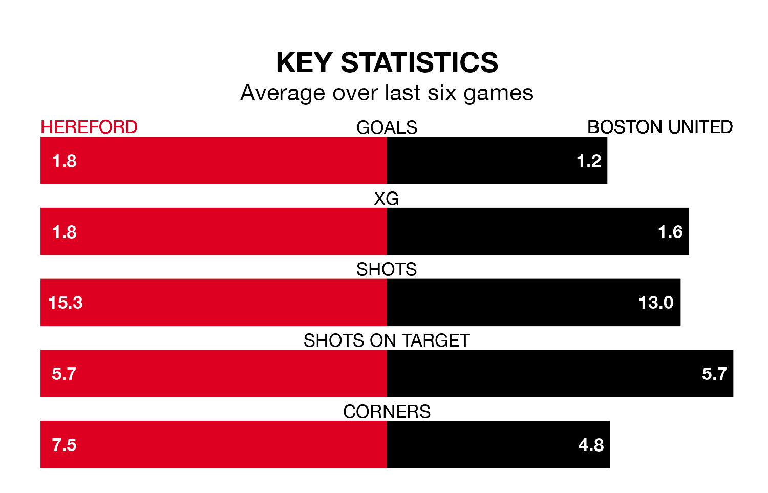 Hereford are also above average scorers, with 1.4 goals per game, compared to a league average of 1.3. They have also conceded 1.4 goals per game.