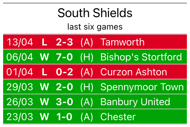 In their last league match, on April 13, South Shields lost to Tamworth 3-2 away.