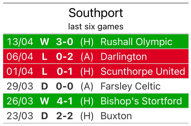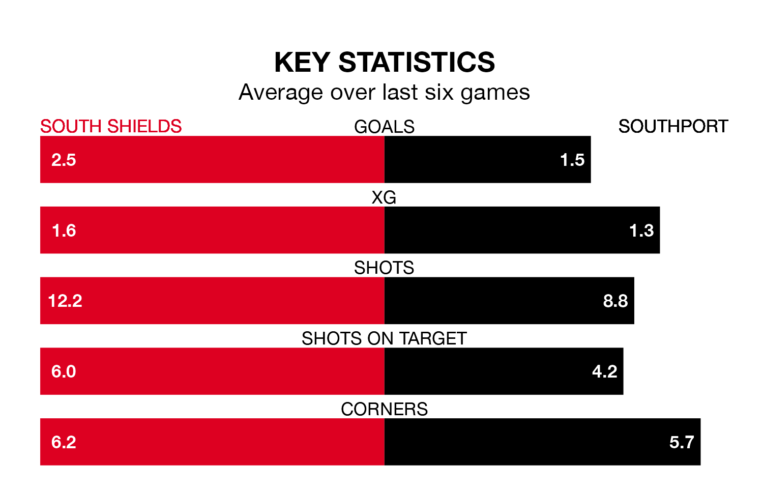 Southport, meanwhile, are below average scorers, with 1.2 goals per game, compared to a league average of 1.3. They have conceded 1.6 goals per game.