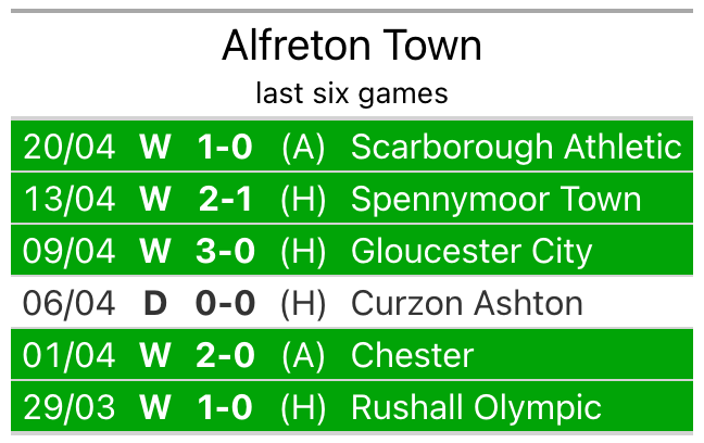 Alfreton’s last match was on Saturday, a 1-0 win against Scarborough Athletic.