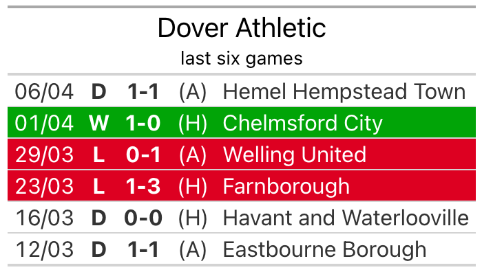 Dover drew 1-1 with Hemel Hempstead Town last time out, on April 6.