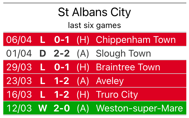 St Albans’s last match was on April 6, a 1-0 loss against Chippenham Town.