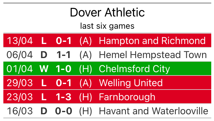 Dover are bottom of the table after 44 games, of which they have won four and drawn 15, earning 27 points.