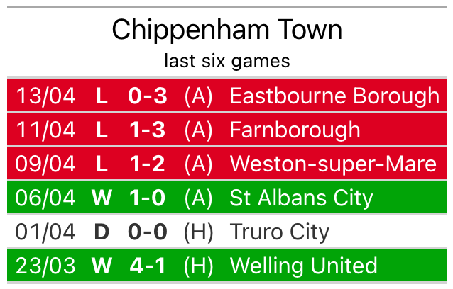 Chippenham’s last match was on April 13, a 3-0 loss against Eastbourne Borough.