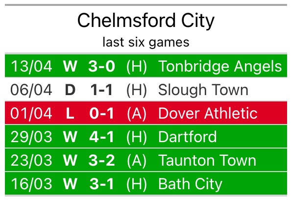 Chelmsford beat Tonbridge Angels 3-0 last time out, also on April 13.
