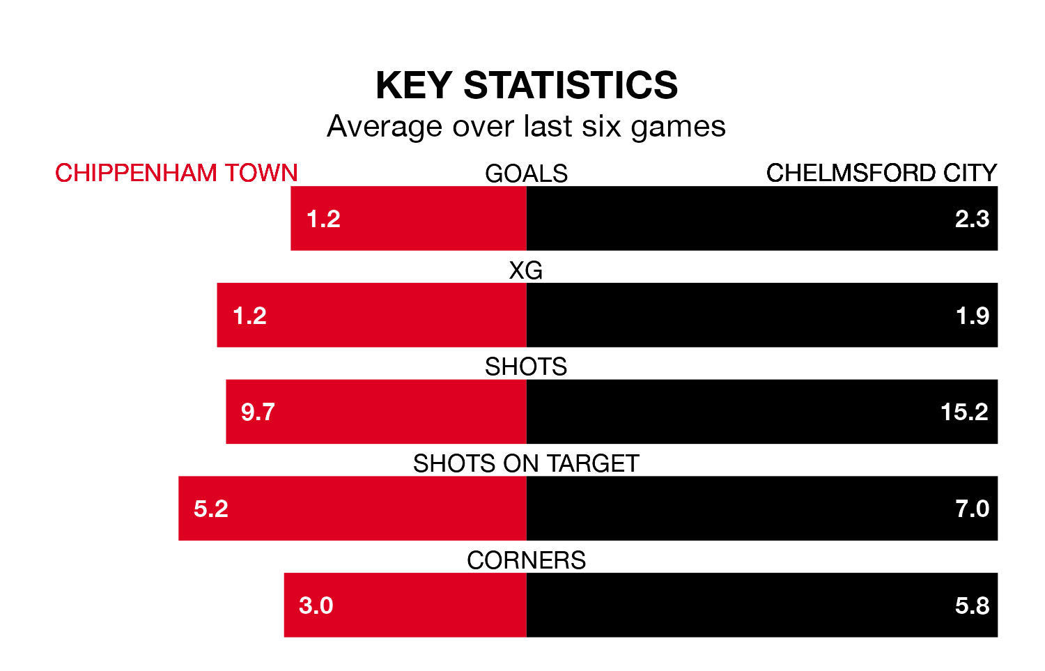 On average, Chippenham scored 1.2 goals and Chelmsford 1.2 in those matches.
