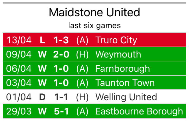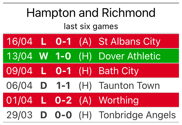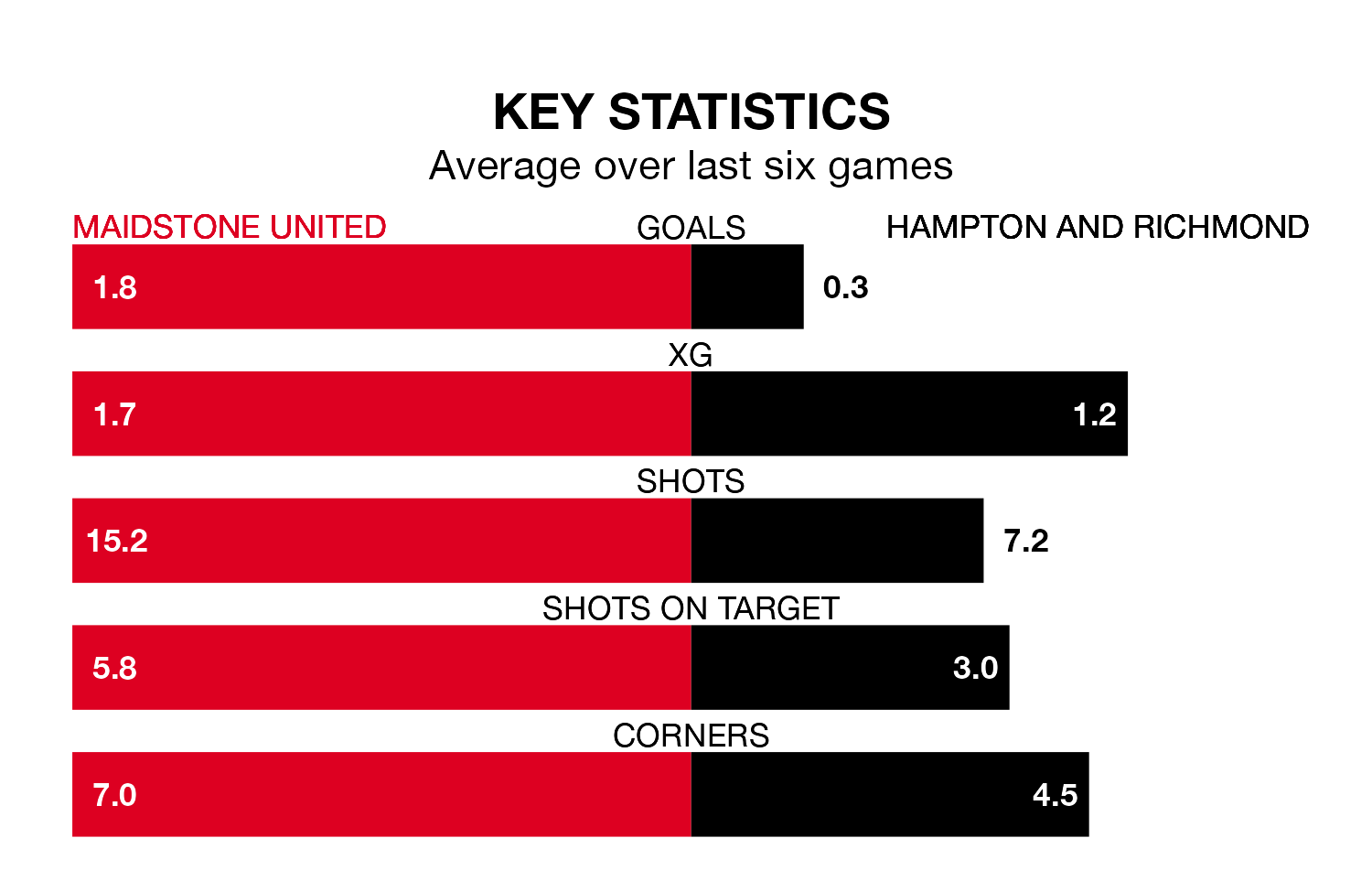 With a win and two draws over that period, Hampton & Richmond’s form is much worse – they have taken five points from 18, compared to Maidstone’s 13.