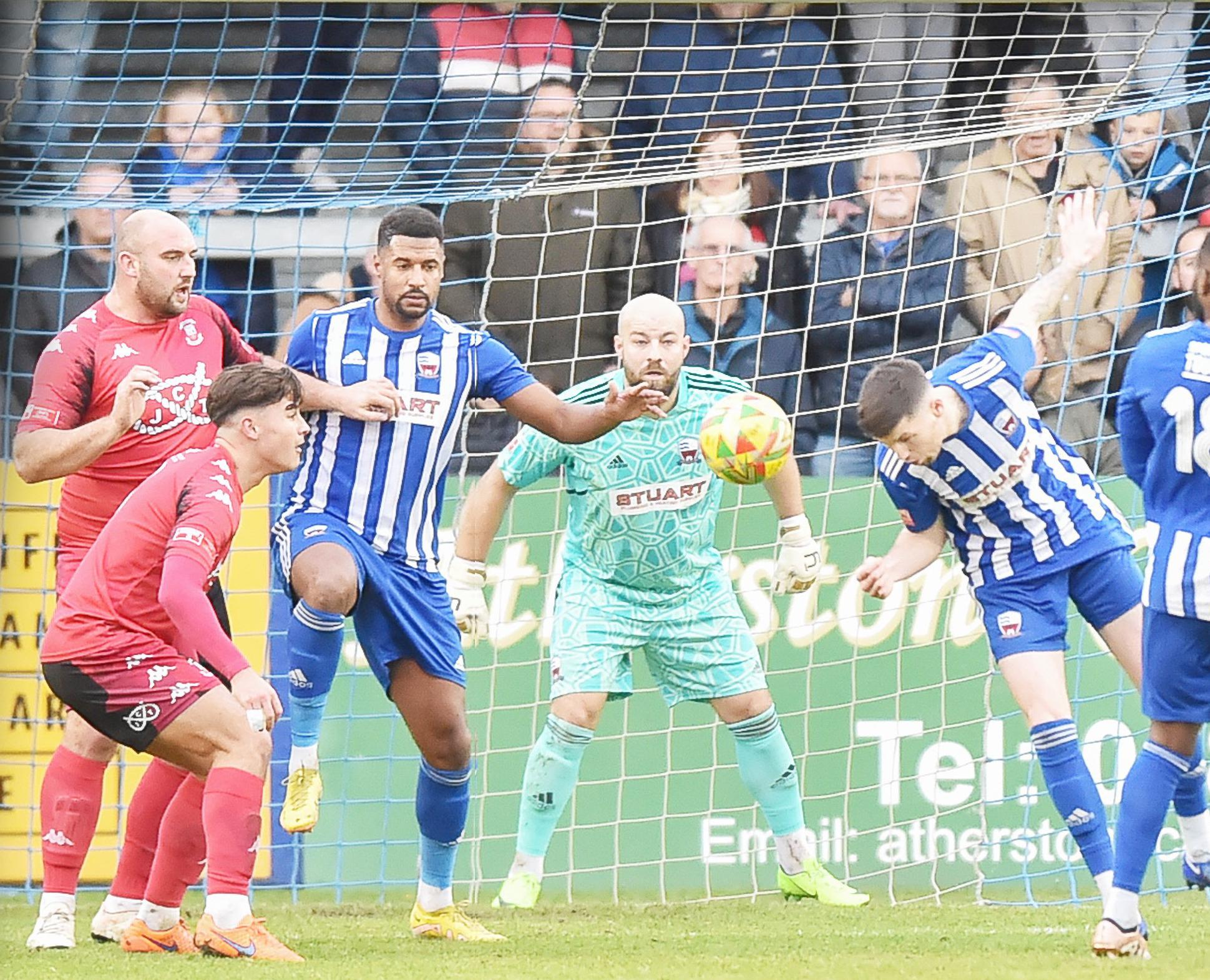 HEAD DOWN: Nuneaton’s Matt Stenson clears the danger