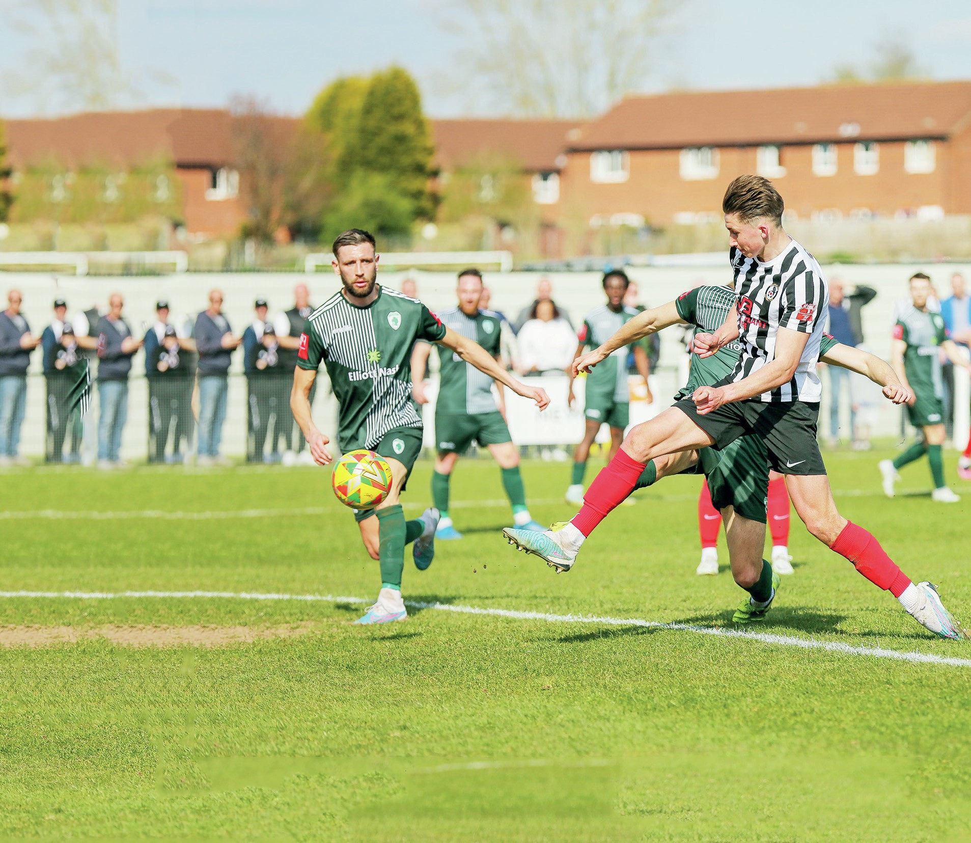 MAX POWER: Coalville’s Max Brogan scores the equaliser and, inset top, Ashley Chambers gets in a shot, while Bromsgrove keeper Ollie Taylor claims under pressure, inset bottom