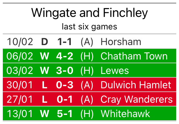 With a win and two draws over that period, the away team’s form is worse – they have taken five points from 18, compared to Wingate & Finchley’s 10.