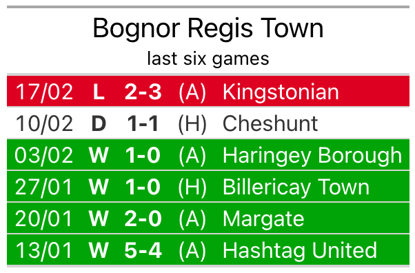 In their last league match, on February 17, Bognor Regis lost to Kingstonian 3-2 away.