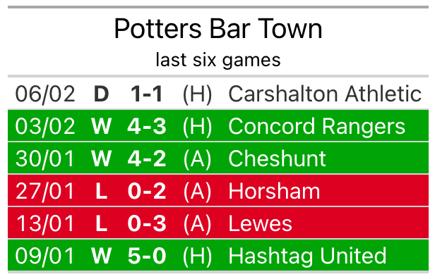 Potters Bar drew, 1-1 at home against Carshalton Athletic on February 6.