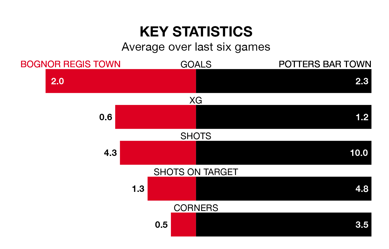 With three wins and a draw over that period, Potters Bar’s form is worse – they have taken 10 points from 18, compared to Bognor Regis’s 13.