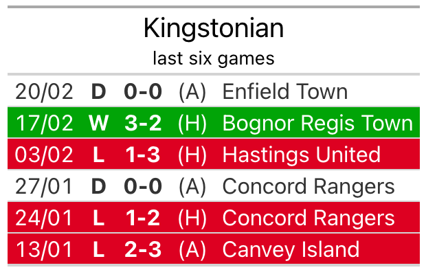 Kingstonian drew 0-0 with Enfield Town last time out, on Tuesday.