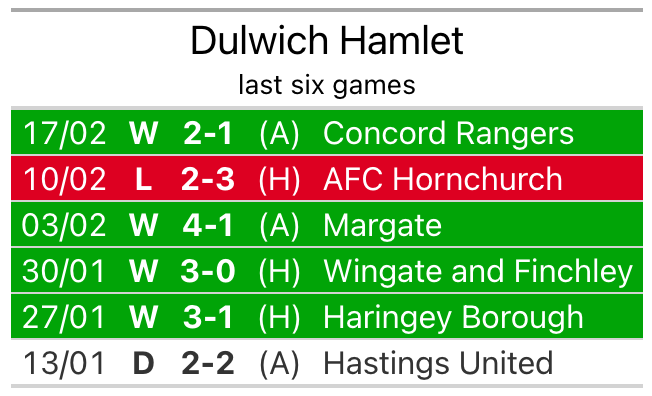 Dulwich Hamlet’s last match was on February 17, a 2-1 win against Concord Rangers.