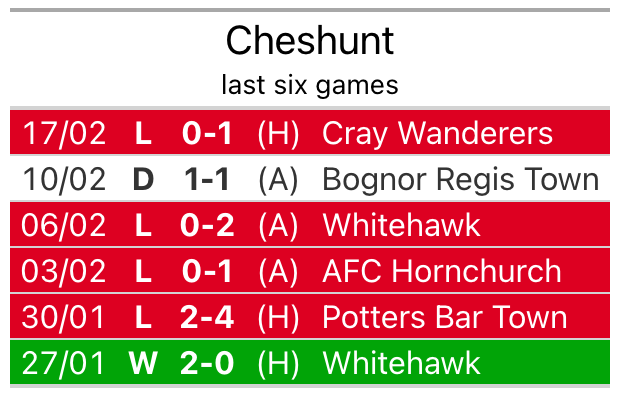 Cheshunt lost 1-0 against Cray Wanderers last time out, also on February 17.