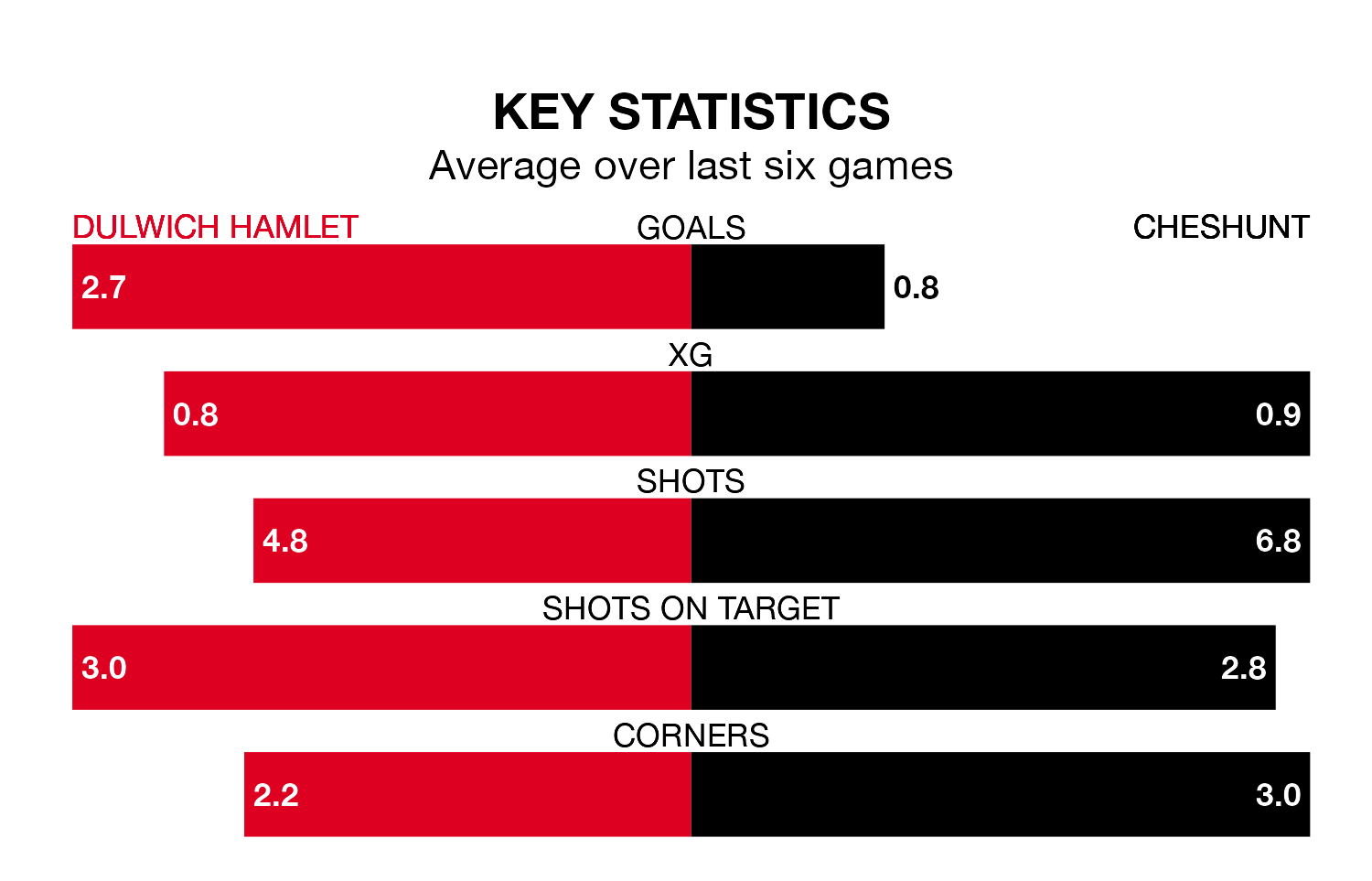 On average, Dulwich Hamlet scored 1.8 goals and Cheshunt 0.6 in those matches.