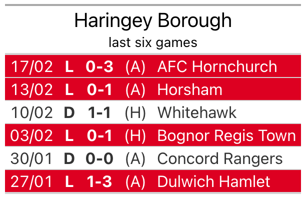 Haringey’s last match was on February 17, a 3-0 loss against AFC Hornchurch.
