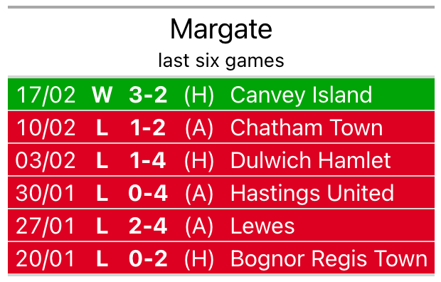 Margate beat Canvey Island 3-2 last time out, also on February 17.