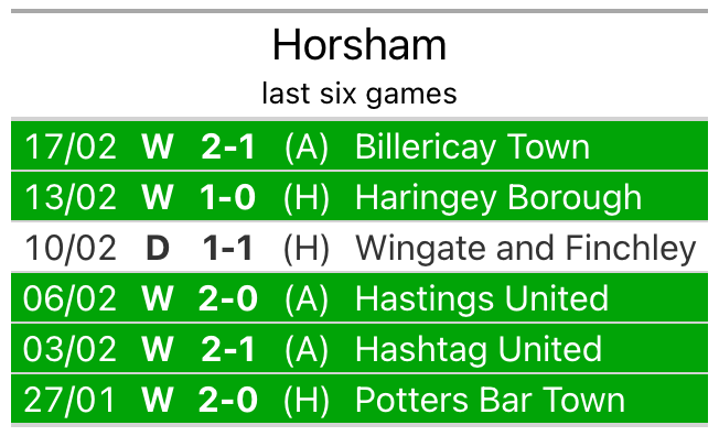 Horsham’s last match was on February 17, a 2-1 win against Billericay Town.