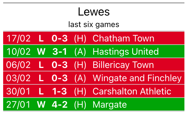 Lewes lost 3-0 against Chatham Town last time out, also on February 17.