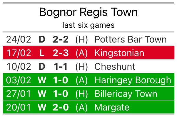Bognor Regis’s last match was on Saturday, a 2-2 draw against Potters Bar Town.