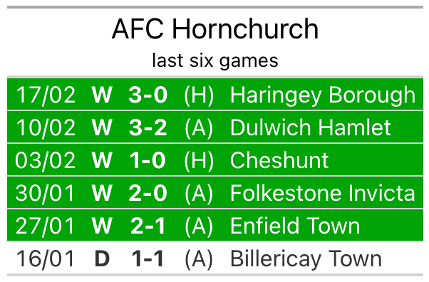 They face a Hornchurch side who picked up a win in their last match, a 3-0 victory against Haringey Borough, and who sit first in the table.