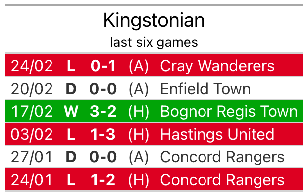 Kingstonian are also below average scorers, with 1.4 goals per game, compared to a league average of 1.6. They have conceded 2.1 goals per game.