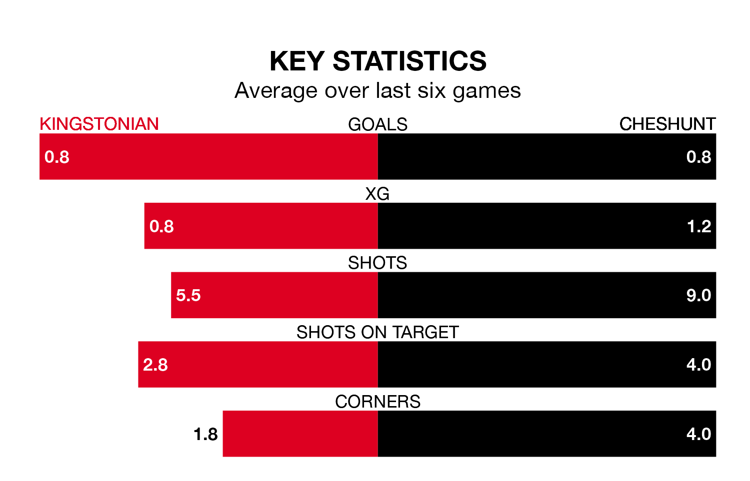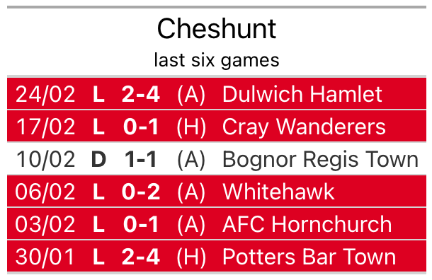 With no wins and a draw over that period, Cheshunt’s form is worse – they have taken one point from 18, compared to the hosts’ five.