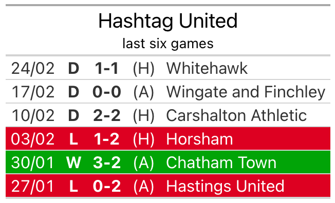 They face a Hashtag side who secured a draw in their last match, a 1-1 tie with Whitehawk, and who sit 12th in the table.