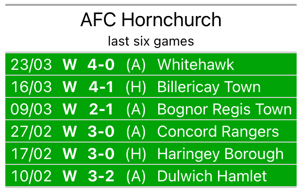 Hornchurch are in exceptional form in the Isthmian Premier Division, with six wins and no losses from their last six games.