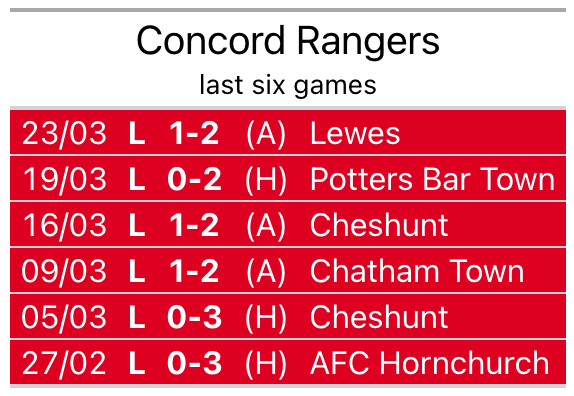 Concord Rangers are 21st in the Isthmian Premier Division table, and have picked up five wins and six draws in their 31 games to date.