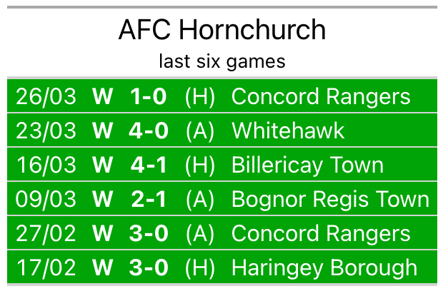 Hornchurch’s last match was on Tuesday, a 1-0 win against Concord Rangers.