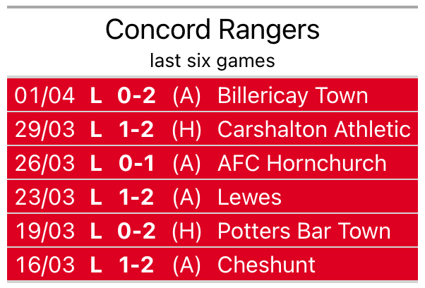 Concord’s last match was on Monday, a 2-0 loss against Billericay Town.
