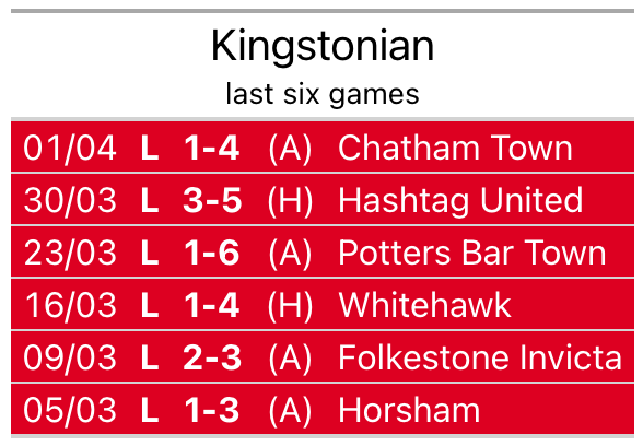 Kingstonian are bottom of the table after 36 games, of which they have won four and drawn six, earning 18 points.